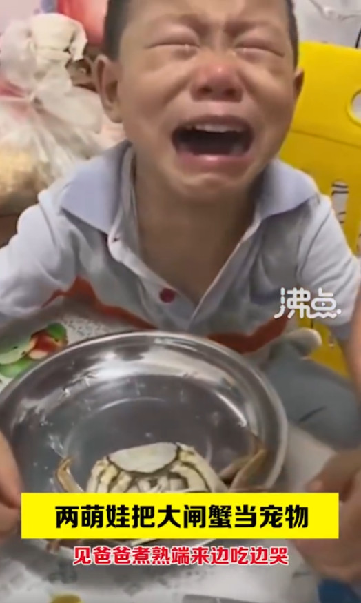 影片中可見,爸爸對著孩子說:「弟弟的這個(螃蟹)也煮熟了」,聽到噩耗的小兄弟當場崩潰痛哭,媽媽不但沒有安慰,反而將蟹肉塞到孩子嘴邊威脅:「吃不吃?不吃我吃了」,爸爸更追問小兒子螃蟹味道如何,孩子只能邊哭邊回答:「香的味道」。兩個孩子哭得聲嘶力竭,大顆淚珠不斷滑落臉龐,畫面令人不忍。