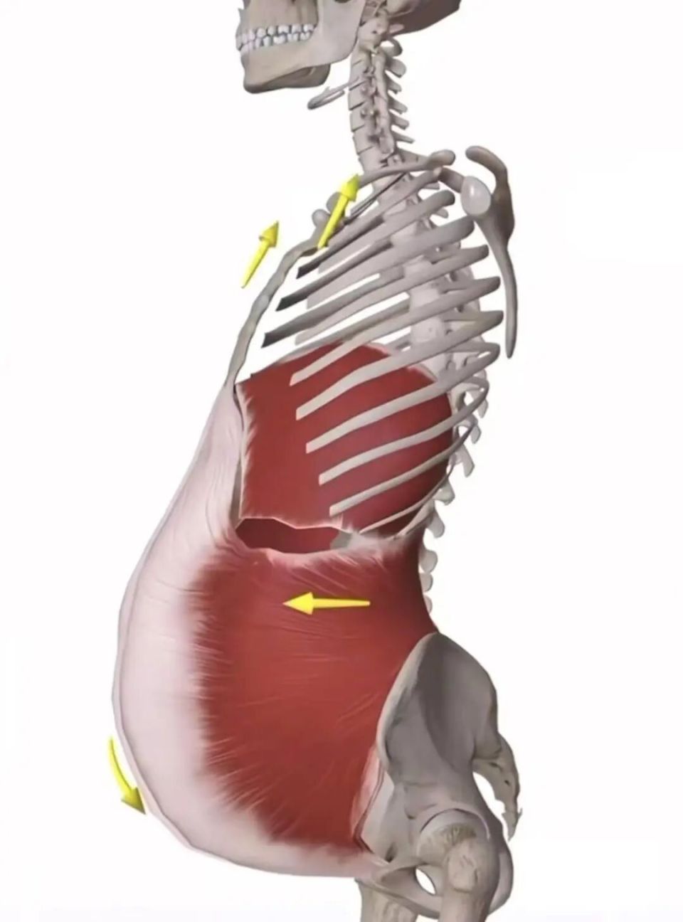 當胸腔和腹腔共用這層「蹦床」時,就可能出現胸腔長期下壓,擠壓內臟位移空間,迫使腹部向前凸出的局面。
