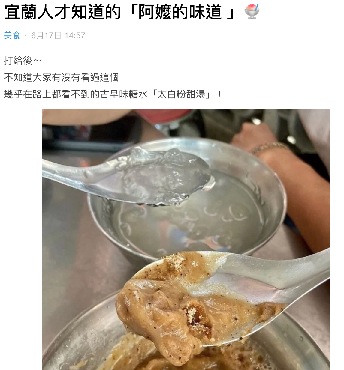 據《TVBS》報導,日前有網友在論壇「Dcard」分享,提到這是只有宜蘭才知道「阿嬤的味道」,原PO寫道:「大家好~不知道大家有沒有看過這個?幾乎在路上都看不到的古早味糖水。」照片裡,這碗透明又濃稠的東西,乍看之下好像有點怪,其實是許多人念念不忘的「太白粉甜湯」!