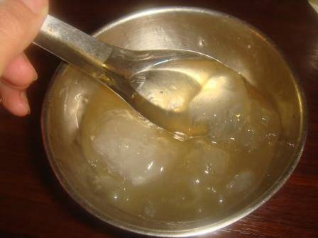 如果想在家裡自己做,請先準備日式太白粉30g、常溫水30g、滾燙熱水適量(約 200cc)、砂糖(或黑糖) 1~2匙,首先,將太白粉放入碗中,先加少許冷水攪勻,水絕對不能多於太白粉,接著,另外燒滾一壺水,往太白粉漿裡面倒入,此時,太白粉將會熟化凝結,可用刀子切成合適入口大小,最後,倒入調製好的糖水,就完成啦。