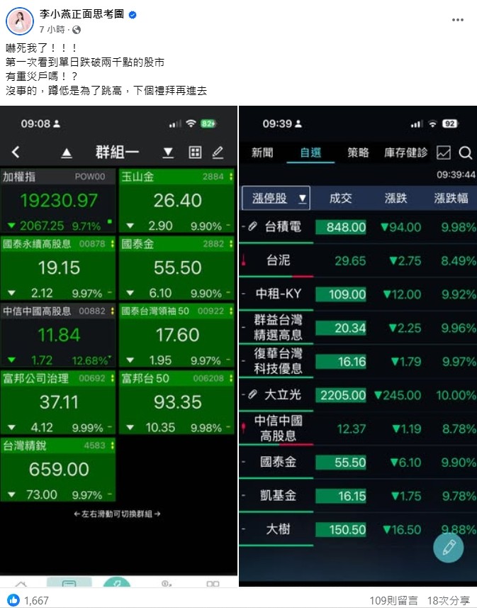 李燕在臉書上連用3個驚嘆號直呼:「嚇死我了!」她震驚表示:「第一次看到單日跌破兩千點的股市。」不過她也信心喊話,認為蹲得越低是為了跳得越高:「等下禮拜再進去!」也打趣地問有沒有其它重災戶。至於她的老公,則是表示現在淨值已經賠掉一台國產車,但也坦言:「反正也賣不掉,先截個圖留念一下。」表示接下來可能還會下跌一段時間,要大家靜觀其變。