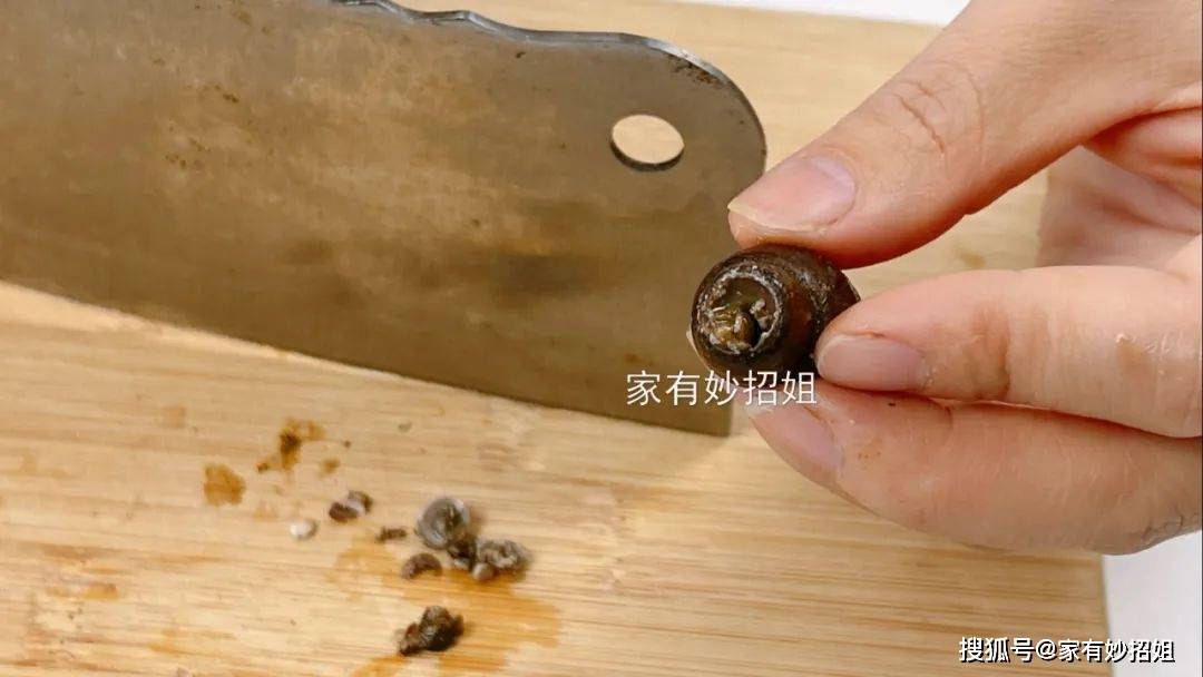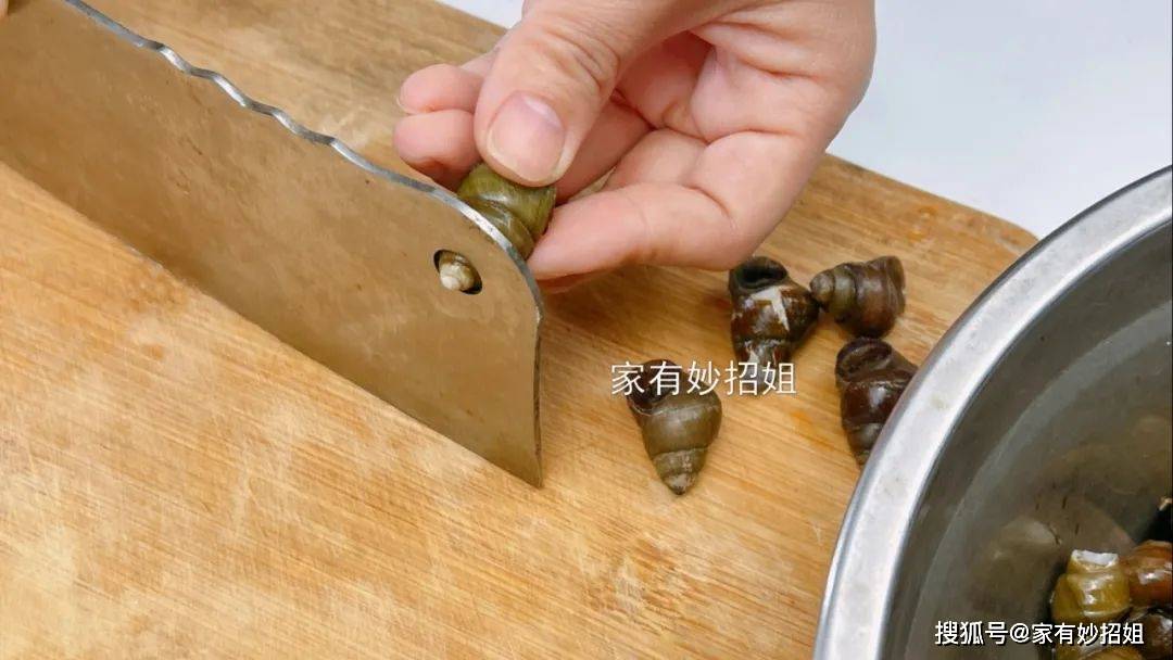 接下來我們再拿把菜刀,用刀背敲去螺螄露出來的尾部就可以了。一個螺螄尾也就處理好了,非常的簡單快速。