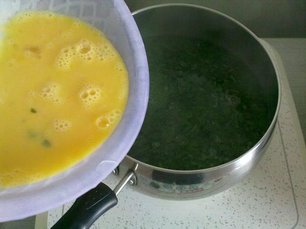 3、煮開艾葉以後,倒入雞蛋液煮開。