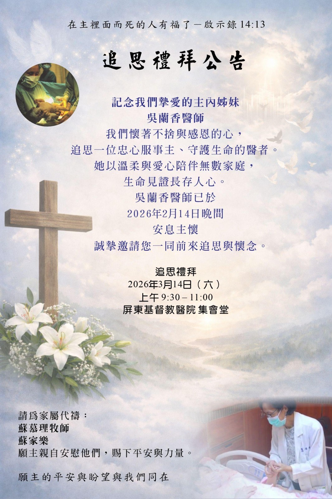 最後一刻仍堅守崗位!婦產名醫「驚傳過世」享年67歲 Elmo 2026-03-06 檢舉 分享到 Facebook 圖片來源:《自由時報》消息傳出後,許多曾受她照顧的家庭紛紛表達哀悼。網友們留言:「感謝吳醫師當年接生我的孩子,她是真正的天使」、「這樣的醫者令人敬佩,即使生病也不忘初心」、「屏東失去了一位偉大的醫師,願她一路好走」、「四十年如一日守護生命,這份堅持讓人動容」、「希望吳醫師在天上能好好休息,不用再那麼辛苦了」。圖片來源:《TVBS》願她一路好走...資料來源:《TVBS》 Advertisements 回首頁 2/2 Advertisements 猜你會喜歡 演出多部火紅戲劇!她卻在當紅之際「結束短暫24年人生」 曾遭受高層欺壓「悲痛留下遺書」 抽搐痛別恩師!Ella徹夜回台「趕赴袁惟仁告別式」 她突然現身「10年恩怨畫句點」 59歲活成29歲!凍齡男神天天「吃8種抗老食物」被封不老傳說:秘訣不是靠醫美 編輯精選推薦 More + 快養不起小孩!本土男星「開計程車、斜槓房仲」 突宣布「離開台灣」:演藝圈沒工作 弟成植物人、姊猝逝!玉女歌手「遭前夫設套」騙走娘家房產 「狠斬16年婚姻」近況曝 趕在40歲前閃婚!八點檔女星「宣布嫁給他」 尪驚人身分曝「媒人是柯叔元」 本土劇女星生了!7年前凍卵「終於來到我身邊」 歌手尪嗨喊:生個足球隊 離婚11年!洪榮宏愛女結婚「終破冰前妻」 「2爸爸牽她進場」催淚畫面曝 功德圓滿了!台語歌后「悲曝他離世」享壽95歲 淚喊:去當快樂的神仙吧... 22歲愛女病逝!資深男星「走不出喪女痛」留白長髮現身 掛骨灰項鍊「代女做1事」惹淚 15歲兒「睡夢中離世」!本土女星「送愛子火化」求做1事 「PO照圓滿了」:媽媽和你永不分開 「天然消炎藥」被發現了!女人常吃「遠離炎症」 延緩衰老:保護子宮 最新/賈靜雯深夜慟曝「她已離世」 淚PO合照喊:真的好愛你... 千萬起家厝賣掉了!張秀卿認手頭緊「為女兒月花20萬」 她超爭氣「進軍美國」成台灣之光 曾比江蕙紅!台語歌后「爆未婚生子」遭指指點點 「2次手術害癱瘓」72歲近況曝 晚年隱居台東!68歲名主持失蹤「車內身亡」 伴侶悲曝「死前做1事」:還掛念著我 24歲兒失明!于美人爆「他在飯店掃廁所」維生 不盼紅包只求「別再花我的錢」 伊朗總統不忍了!開出「停戰3條件」:美國、以色列不可拒絕 以為只是小感冒!本土女星悲痛證實「他併發肺炎過世」 一度淚灑現場「後悔同意插管」 44歲許維恩罹乳癌!醫示警「3日常用品」易致癌:別碰才能保命 濕紙巾暗藏致命細菌!62人感染6死「4品牌停止販售」 婚變尪落跑!單親媽「獨扛千萬債養孩」到處躲黑道 「一開口驚艷眾人」熬成台灣歌后 看似舒適其實比高跟鞋還傷!骨科醫師點名「5鞋款超傷腳」 長期慢性傷害「比骨折更難救」 65歲男星獨居暴斃!大咖女星放下恩怨「送前夫最後一程」 昔遭動手6年嘆「死者為大」 台語歌后慟別摯愛!告別式上認「早隱瞞病情」 道歉哭喊:原諒我簽放棄急救 晚年兒孫滿堂!73歲影壇大哥「拄拐杖現身」腳步蹣跚 兒子「全程攙扶不喊累」網羨:又帥又孝順 空窗多年!68歲陳美鳳突羞認「身邊有個他」 40年前就認識「遭男方母親拆散」 85歲失智父身亡!林葉亭突宣布「皈依佛門」 遇大師「開示一番話」忍不住淚崩