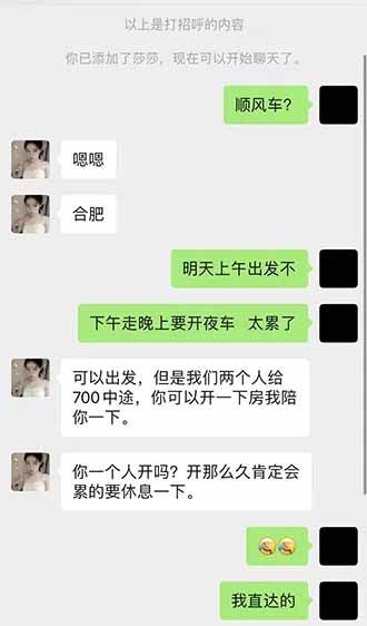 莎莎嘗試以肉體作為補償,「中途你可以開一下房,我陪你一下」,希望能將車價減至人民幣700元(約新台幣3072元)。司機則沒有動搖,仍希望對方先付款確認,不能僅付訂金。莎莎則再次討價還價,PO出2張美女照片,「我閨蜜,她說能不能讓你睡一次抵車費。我們倆一人一次」。