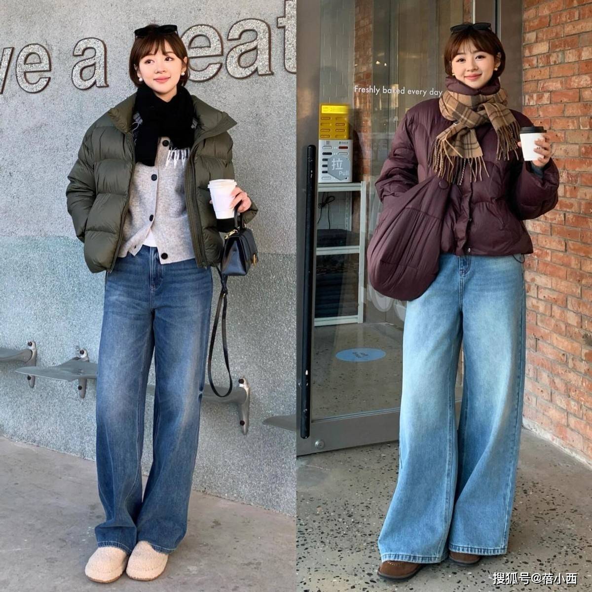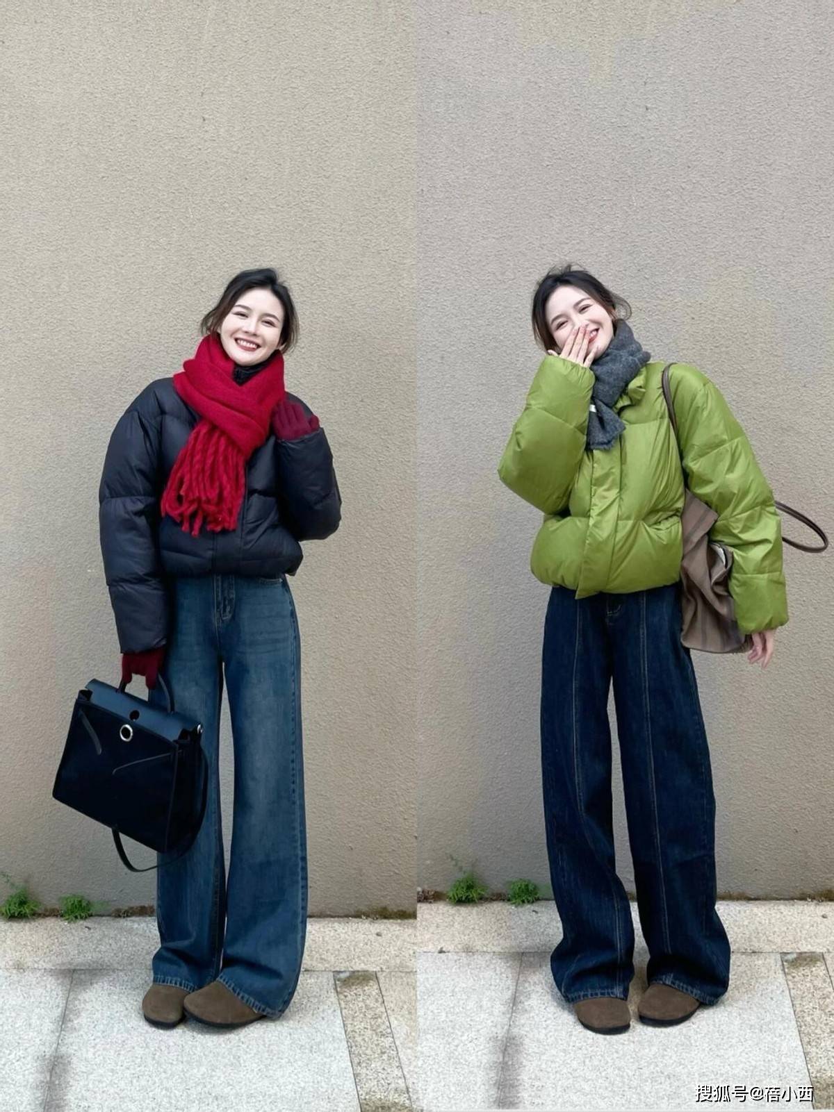 基礎色的羽絨衣搭配深藍色闊腿牛仔褲太單調了怎麼辦?可以試著用撞色的圍巾點綴一下,立馬就可以增加搭配亮點,顯得很時髦新潮。