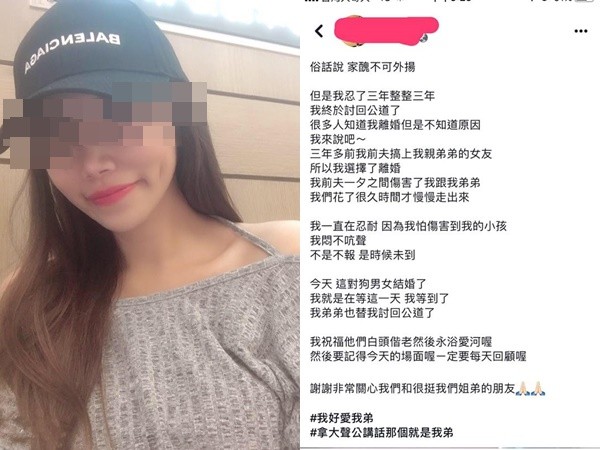 正宮的外貌相當姣好,有著白皙的皮膚,她出面表示「我忍了3年終於討回公道,很多人知道我離婚但不知道原因,3年多前我的丈夫跟我弟弟前女友婚外情,所以我選擇離婚,我跟我弟弟花了久時間才走出來,我一直在忍耐怕傷到小孩,我悶不吭聲不是不報,是時候未到,今天這對狗男女結婚,我就是在等這天也等到了,我弟弟也幫我討回公道,祝她們頭偕老永浴愛河,然後今天這場面一定要回顧喔。」。
