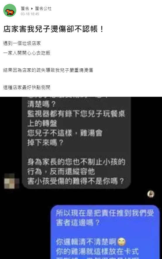小孩狂玩餐桌轉盤!家長怒控餐廳「打翻湯害我兒子燙傷」 不爽喊「如果有固定好就不會掉」網全挺店家 別問我素隨 2023-03-22 檢舉 分享到 Facebook 沒想到這位家長說的話,卻點燃了網友們的怒火,超過3000則留言都在痛斥家長:「快公布監視器,讓這種不成熟的家長變成黑名單」、「店家是要把雞湯用強力膠固定在卡式爐上嗎」、「所以才會匿名嗎!也知道自己有問題」、「為什麼要給小孩玩轉盤?」、「店家的疏失沒錯啊!不該讓你們進來用餐」(來源:《匿名公社》)真的覺得爸媽比較有問題!明明有湯在上面,就該禁止小孩這樣玩了吧~來源:《匿名公社》 Advertisements 回首頁 2/2 Advertisements 猜你會喜歡 兒子送百萬紅包!母親狠拒絕「誰要這些臭錢」 某天「突然收到1萬」含淚收下:我的心肝寶貝 店家過年放假奧客竟回「那去你家」!網友教一招神反擊:奧客全退散 編輯精選推薦 More + 慘遭飛車拖行!八點檔男星「臉全磨爛」驚悚畫面曝 目睹女星「崩潰嚇哭」頻發抖 快訊/桃園驚傳「停課92班」1病毒爆發 疾管署曝:「已9例死亡」 才拿金馬終身成就獎!86歲陳淑芳「連2年再獲全國大獎」 上台坦言「很慚愧」:拿得很心虛.... 曾是窈窕校花!她被丈夫「養胖變165公斤」生活無法自理 7年後近照曝光「現況驚掉下巴」 59歲資深女星「驚傳身亡」!今辦告別式「張小燕、陳美鳳全都到了」 老牌大廠裁員1400人「卻讓員工一夜致富」!他驕傲「曬出離職單」:把我們當家人 香港大火160死!70歲周潤發被爆「身價百億零捐款」 挨轟「祈福哽咽是演戲」他不忍全說了 太殘忍!爸媽「把兒子的寵物煮熟」端上桌猛嗑 小朋友得知後「反應惹怒全網」:以後會有報應 拜陰廟中大獎!楊繡惠痛哭「好友馬上被帶走」釀2死 「一看中獎號碼」當場嚇傻 快訊/才過1年!賴佩霞驚傳「他不幸身亡」急飛美國奔喪 臨終前「女兒陪在身旁」 男子突發腦出血走了!醫生怒斥:「吃降壓藥時候,沒有注意這3點!」 快訊/大咖歌王驚傳「遭兒子刺殺身亡」! 快訊/知名女歌手「驚傳車禍身亡」! 快訊/曾叱吒政壇!蔡英文「最信任的她過世」 死訊被證實「已舉辦告別式」 佛門前不清淨!中台禪寺爆醜聞「下藥昏迷師弟」逞獸慾8次 「黃安妹妹也在內」廟方回應了 王力宏驚喜宣布「再度當爸爸」當場激動落淚! 知名手搖店爆虐狗!15歲失智柯基「被老闆痛打」:把妳安樂死 網友氣炸「議員出手了」 才說案子不會倒!大安區百萬預售屋「驚傳整棟法拍」淪爛尾 2戶苦主慘套牢 15歲失智柯基遭痛打!手搖店老闆爆「配偶竟是醫生」 網怒公審「他深夜緊急聲明」 全遣送中國!台灣873名詐騙犯慘了「外交部出面回應」 快訊/普發現金又來了!這市長霸氣宣布「每個人再發6000元」 人民幣加減賺!68歲台語歌王拍片「狂喊我是中國人」 網友氣炸:「這麼老了還要跪」 台海若開戰「哪縣市最安全?」 網狂推2地:「打都不會打」 27歲男每天喝7、8瓶!走路掰咖去檢查「骨頭全壞死了」 店家全跑光!台灣知名商圈淪空城「只剩娃娃機苦撐」 在地人曝2問題:「難怪沒人敢來...」