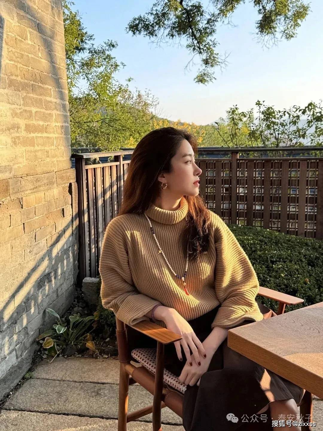楊采鈺穿了一件駝色的毛衣,卷下來的領口優雅安靜,有一種溫柔的氣質。用一條長長的彩色珠鏈點綴,也不會顯得太空。
