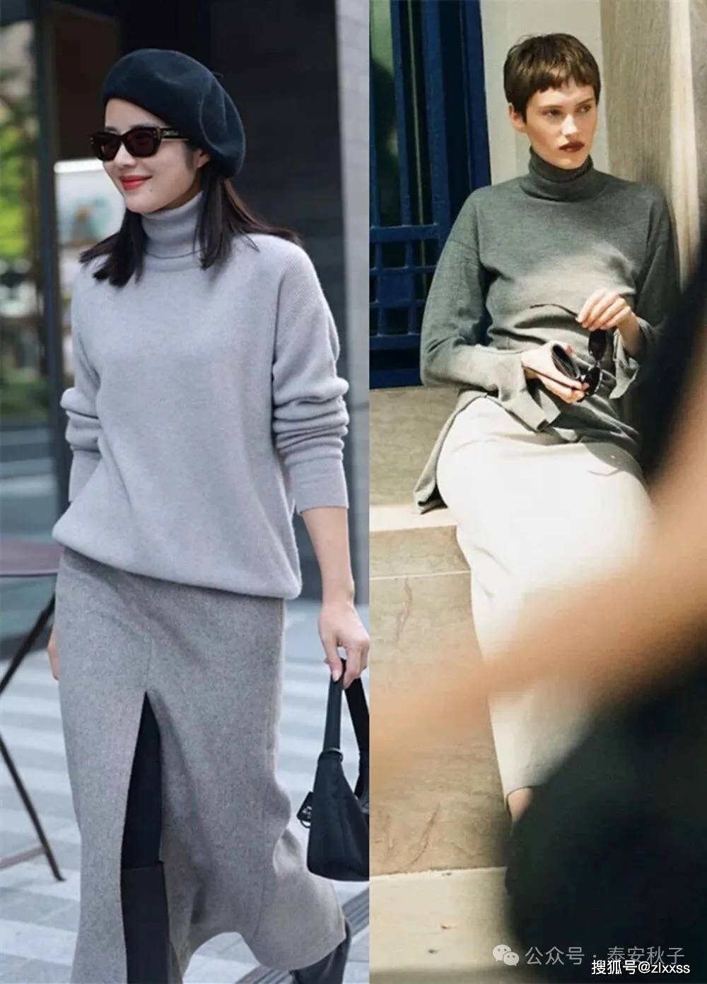 比如灰色系的羊絨衫,帶著一些中性的味道。搭配同色直筒裙統一的配色加上相同材質,可以輕鬆穿出高級感來。