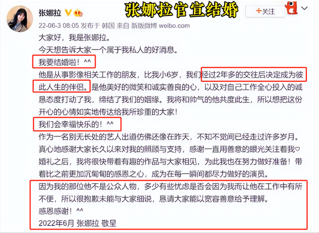 通過自己的演技讓很多觀眾再次認可了張娜拉這個演員,不光如此,她的感情生活也有了著落,在拍戲的時候遇到了她這一生的真愛,經過交往之後決定步入了婚姻的殿堂,同時她也把這個好消息分享給了她的粉絲。