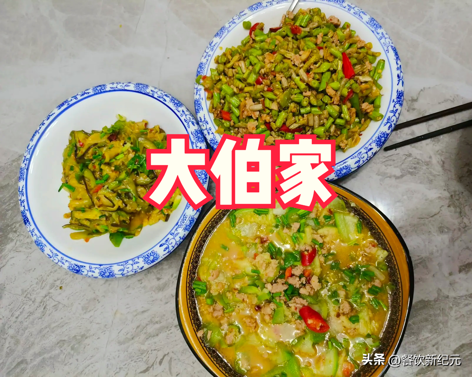 大伯家的招待飯菜:絲瓜炒肉+清炒茄子+豆角炒肉沫。