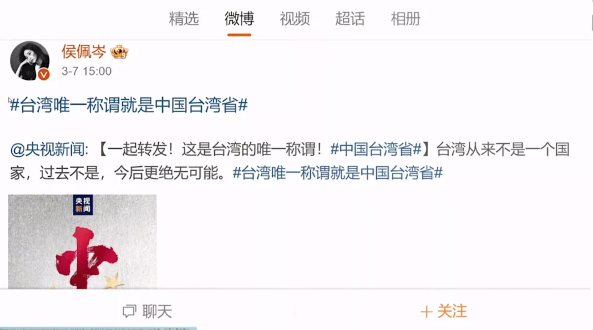 事件源於今年3月,當中國大陸外交部長在「兩會」記者會上發表「台灣地區在聯合國的唯一稱謂就是中國台灣省」後,包括侯佩岑、歐陽娜娜、張韶涵、趙又廷、陳喬恩、陳妍希、汪東城等多位台灣藝人,在微博轉發「台灣唯一稱謂就是中國台灣省」文章並附和相關說法。其中,侯佩岑更是首位響應的台灣藝人。