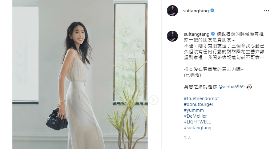 隋棠當時透過IG帳號發文說道:「聽說猶豫的時候願意推妳一把的朋友是真朋友⋯」但她卻對這個說法有些懷疑,因為好友金剛竟然沒經過她的同意,就直接送了三個「甜甜圈花生醬炸雞堡」到她的家裡!這個其實是隋棠心動已久、卻遲遲不敢下單的超高熱量食物,最後她也表示自己已經吃光光,並責怪金剛:「根本沒在尊重我的意志力嘛~」,還強調對方就是萬惡的來源。