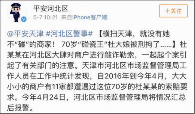 因為她年紀大、疾病又多,警察、商戶們都不敢採取一些強制性的手段,所以杜大娘在天津這一片區域耀武揚威多年,可以說是很出名了,只要看見她,商戶們都想立馬關門,就怕被她碰瓷。她不僅碰瓷飯店餐館,還碰瓷理髮店、超市等等,只要她覺得有機可乘,就必須要給店舖的老闆上一課,讓他們知道什麼叫倚老賣老,什麼叫惡人先告狀。