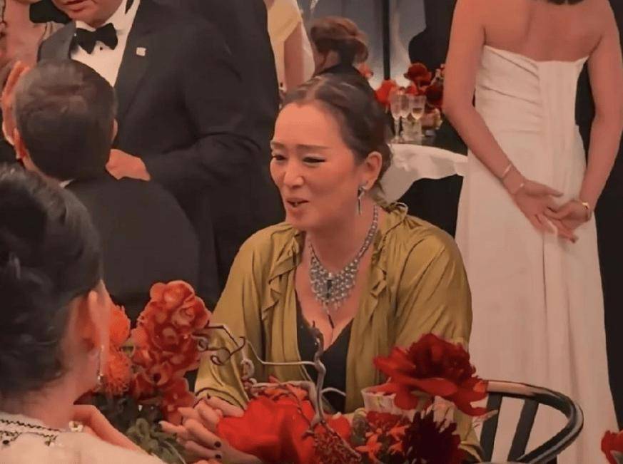 在一次品牌晚宴上,鞏俐依舊光彩照人。黑色V領裙搭配綠絲質上衣,珠寶項鏈一換再換,宛如一位優雅的貴婦。