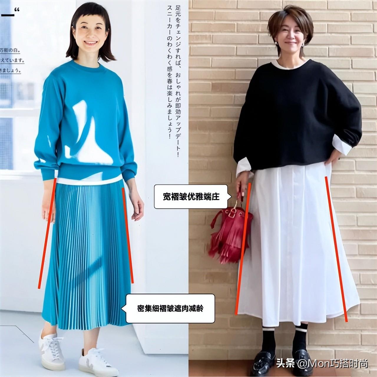 老了后,一條版型寬鬆、能遮住發福身材的裙子是「剛需」。褶皺裙的A字長款版型正好能滿足遮肉需求,變化多端的褶皺還比別的寬鬆裙更時髦減齡!