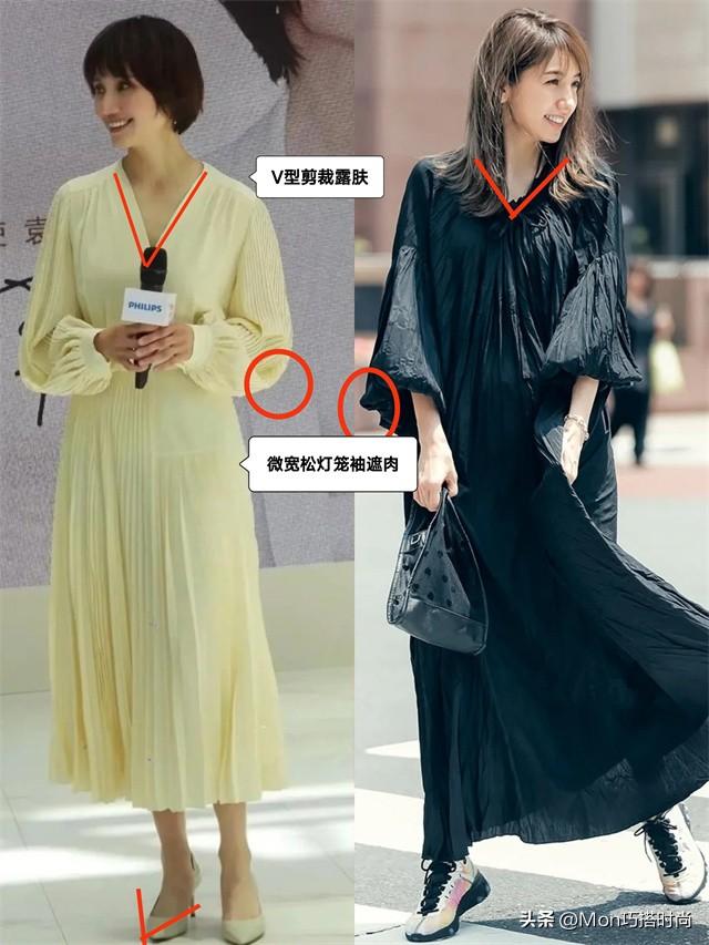 連衣款褶皺裙就不必強調高腰,寬鬆長A型和H型都很遮肉。V型領口露鎖骨,V字尖頭鞋露腳背,照樣氣質顯身材。