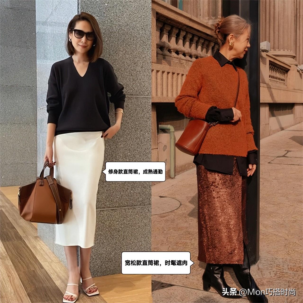 直筒裙也是女人老后的不二之選。利落的版型+質感材質是優雅的王牌組合,配針織衫、襯衫、西裝都分外迷人。