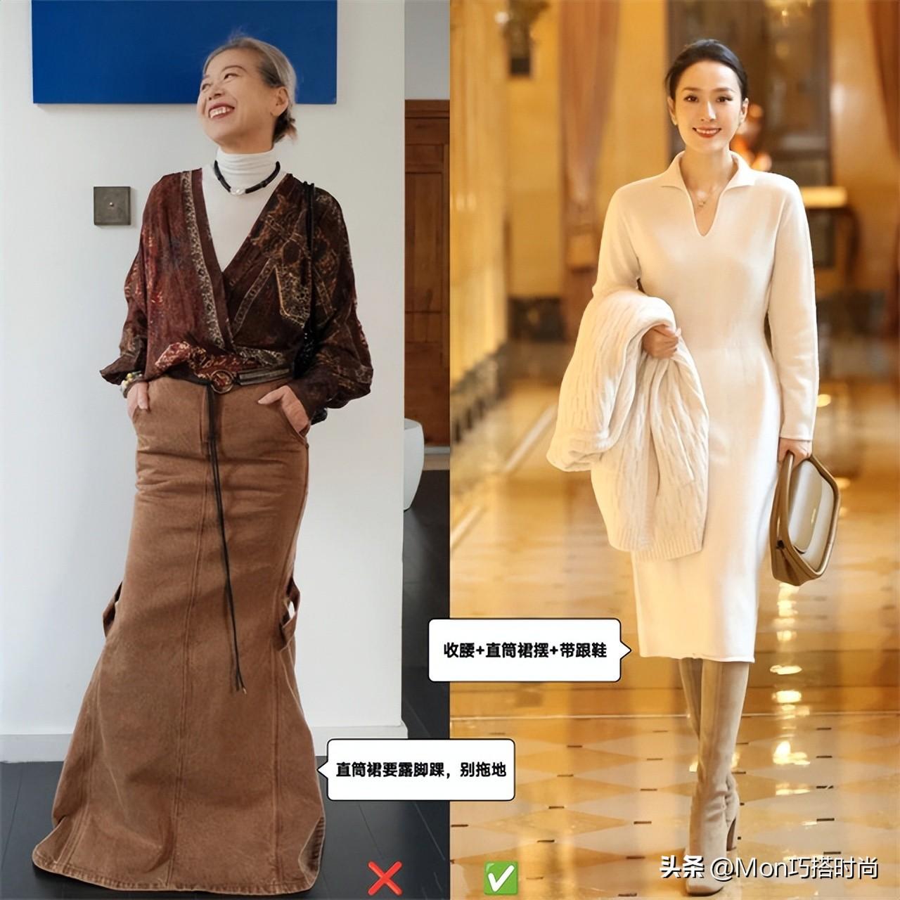 直筒裙要有厚度,長度合適就不會壓個子。膝下露踝、避開小腿肚就是直筒裙理想中的裙長,千萬別選邋遢的拖地長度!