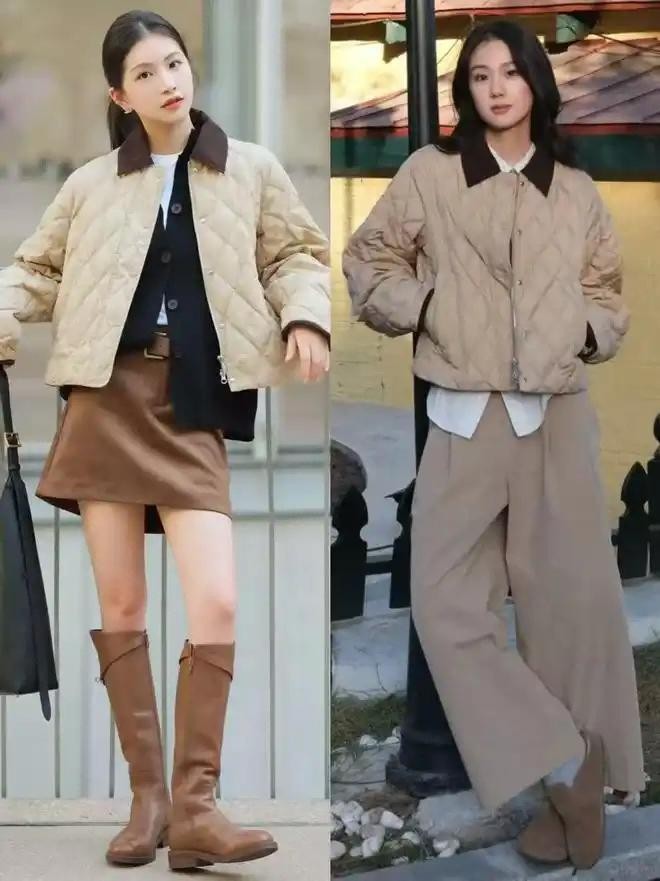 直接選擇深色的奶奶棉服也沒有問題,不過我建議挑選黑色、藏青色這些顏色更深的顏色,不選大地色系,足夠深的顏色才有收縮瞳孔的作用,才能顯瘦,關鍵是絎縫配上深色,有一種高智感,很高級。